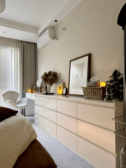 化妝台的尺寸要根據房間的尺寸和佈局來確定。一般來說,化妝台的長度要能夠放下常用的化妝品和護膚品,寬度要足夠容納一個人舒適地坐下。同時,系統櫃化妝台設計還要考慮化妝台與房間其他傢俱的協調性,避免顯得過於擁擠或突兀。